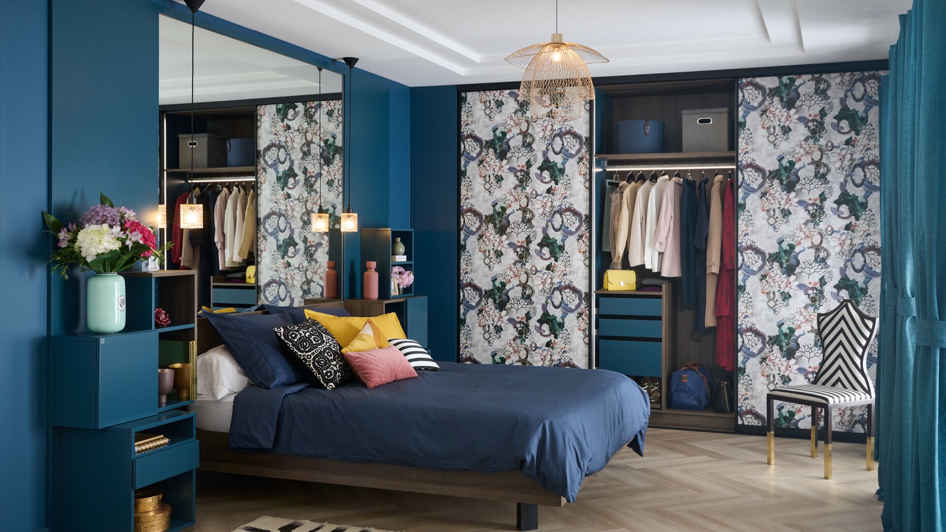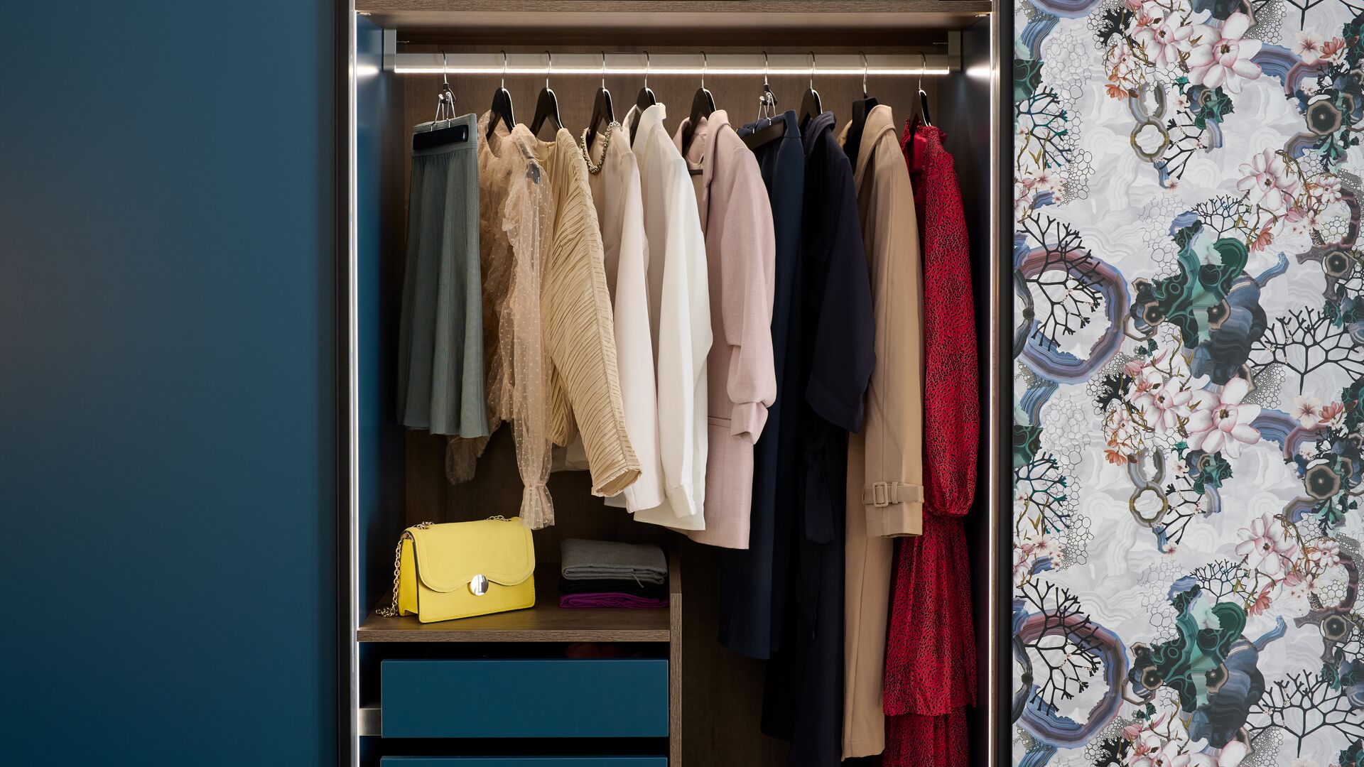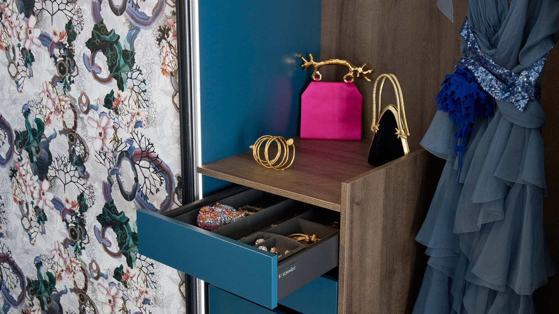 Die Türen des Kleiderschranks ziert das aus der Zusammenarbeit zwischen Schmidt und Christian Lacroix Maison entstandene Dekor Algae Bloom, in dem sich edle Minerale und Meerespflanzen harmonisch miteinander vermischen. Das Dekor in Kombination mit den dunklen Holztönen und dem tiefen Blau sorgt für eine heimelige Atmosphäre. Die Innenbeleuchtung und die eigens zur Aufbewahrung Ihrer schönsten Schmuckstücke ausgestatteten Schubladen machen diesen Kleiderschrank zu einem stilvollen UND funktionalen Einrichtungsgegenstand!