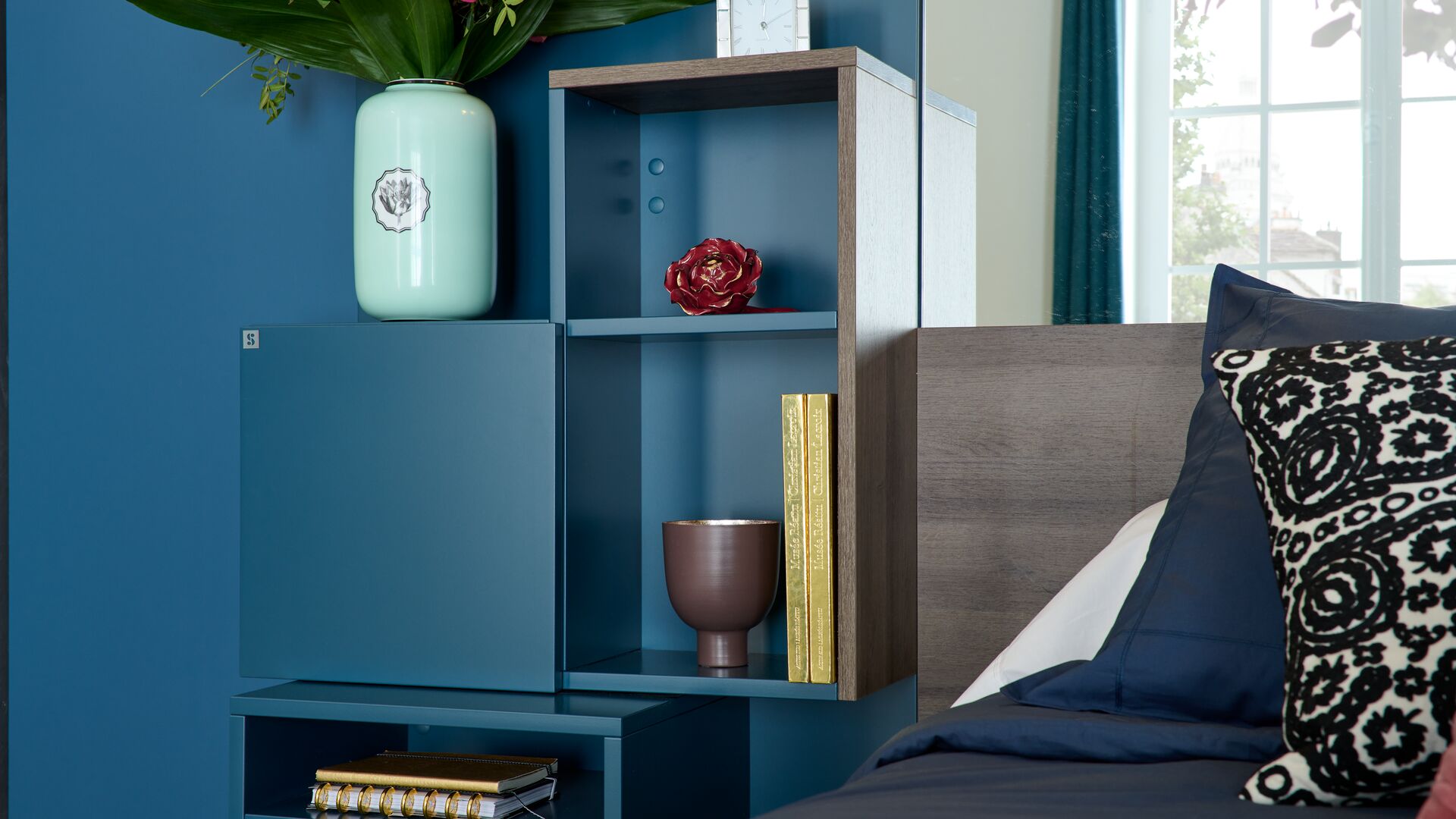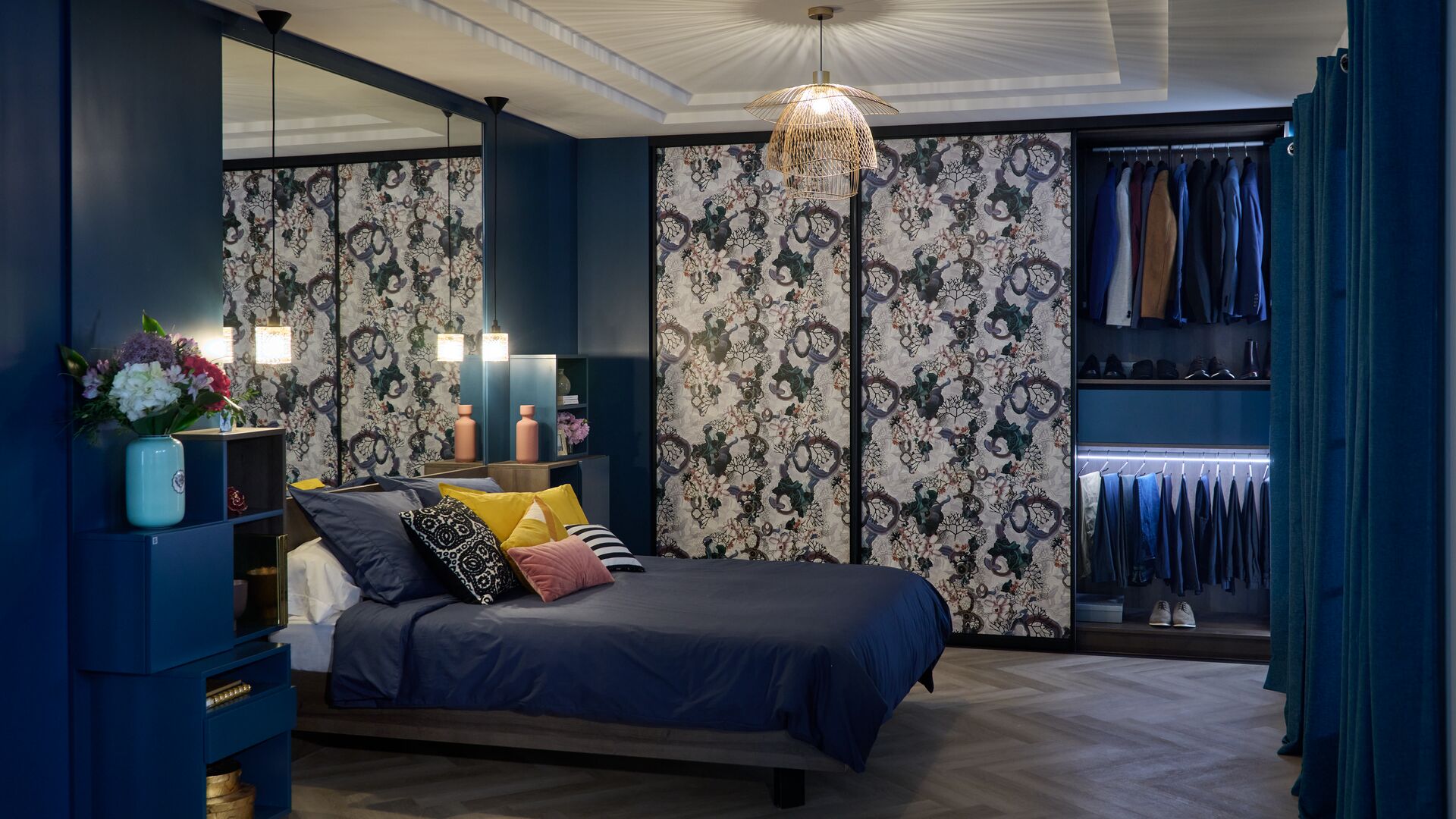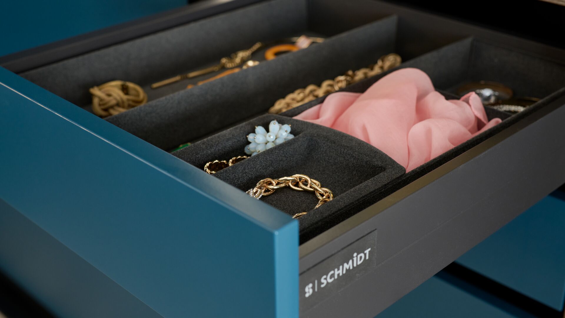 Die Türen des Kleiderschranks ziert das aus der Zusammenarbeit zwischen Schmidt und Christian Lacroix Maison entstandene Dekor Algae Bloom, in dem sich edle Minerale und Meerespflanzen harmonisch miteinander vermischen. Das Dekor in Kombination mit den dunklen Holztönen und dem tiefen Blau sorgt für eine heimelige Atmosphäre. Die Innenbeleuchtung und die eigens zur Aufbewahrung Ihrer schönsten Schmuckstücke ausgestatteten Schubladen machen diesen Kleiderschrank zu einem stilvollen UND funktionalen Einrichtungsgegenstand!
