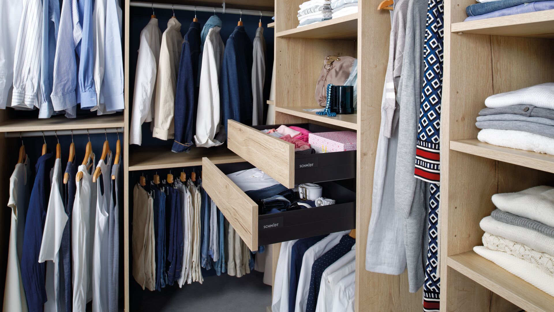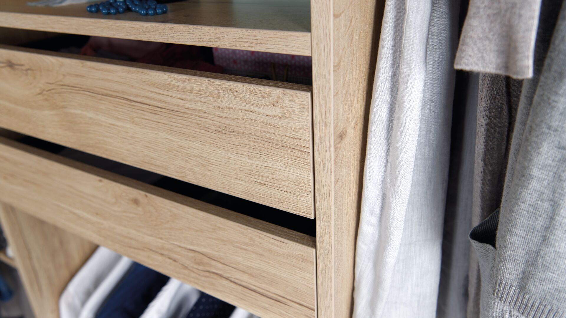 Sie träumte von einer erstklassigen Ankleide… Er wollte ihr einen Gefallen tun, aber vor allem auch diese ungenutzte Raumecke möblieren. Sie haben diesen hübschen Holzton Pastel Oak gefunden, der perfekt mit Ihrer Deko harmoniert. Kein Geschnörkel sondern das Wesentliche, das Bestand hat, gut gemacht, sogfältig, in exakt Ihren Maßen. Garderobe in einer sehr hohen Nische für ihre langen Kleider, ein Mix aus Böden/Kleiderstangen/Schubkästen für seine Sachen… für eine ideal optimierte offene Eck-Ankleide.