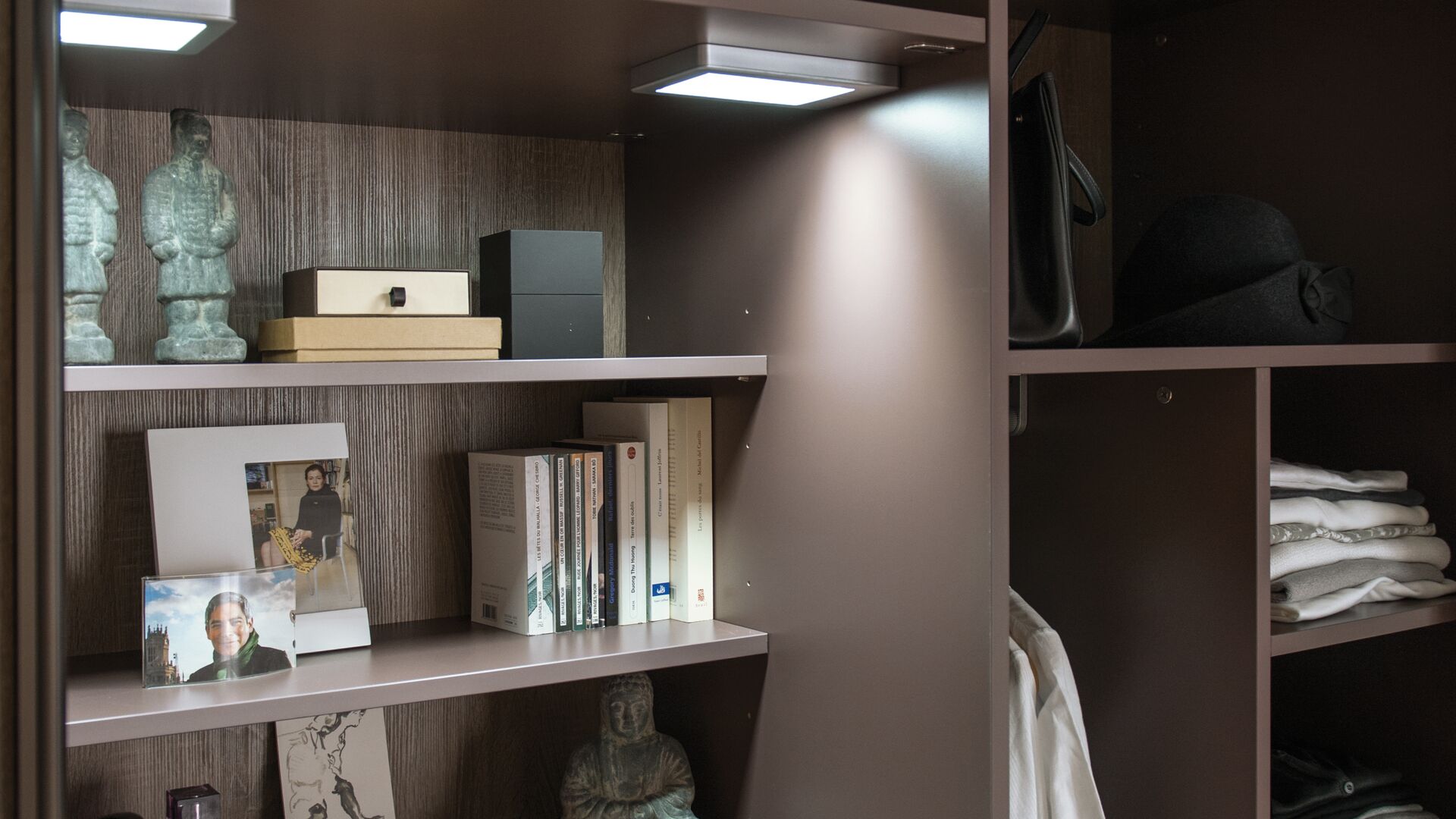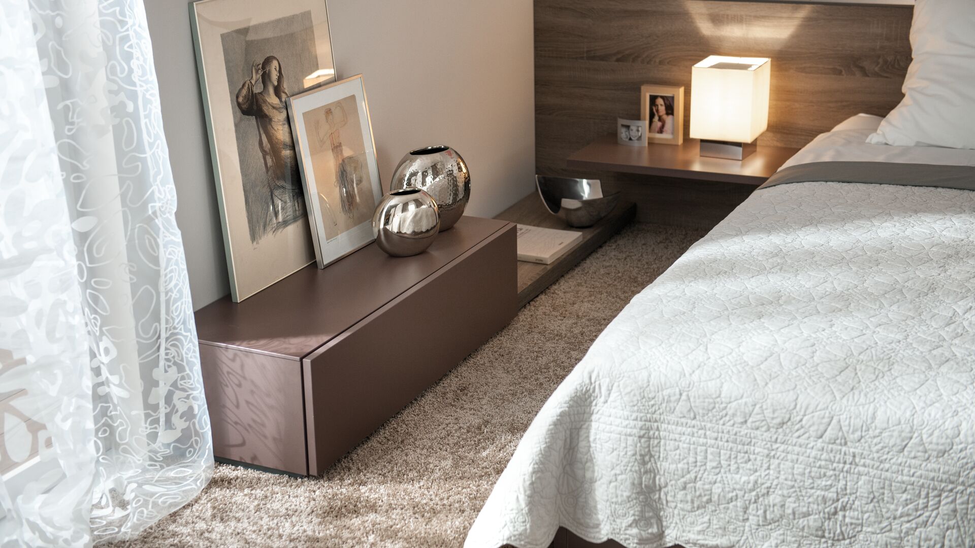 Willkommen in Ihrem neuen Kokon, einem Schlafzimmer, in dem alles warm, praktisch und ordentlich ist – wie die Nachttische mit Klappe und der große maßgefertigte Designer-Schrank, der sie bewundert. Mit einem Finger geöffnet, beleuchtet er mit einem sanften aber präzisen Licht und enthüllt sein Innenleben: individualsierte Schubkästen und Auszüge, unauffällige Eleganz auf allen Ebenen.