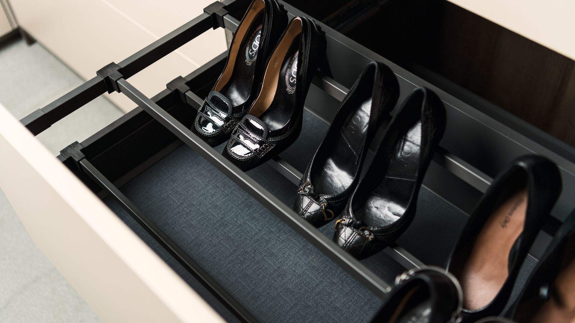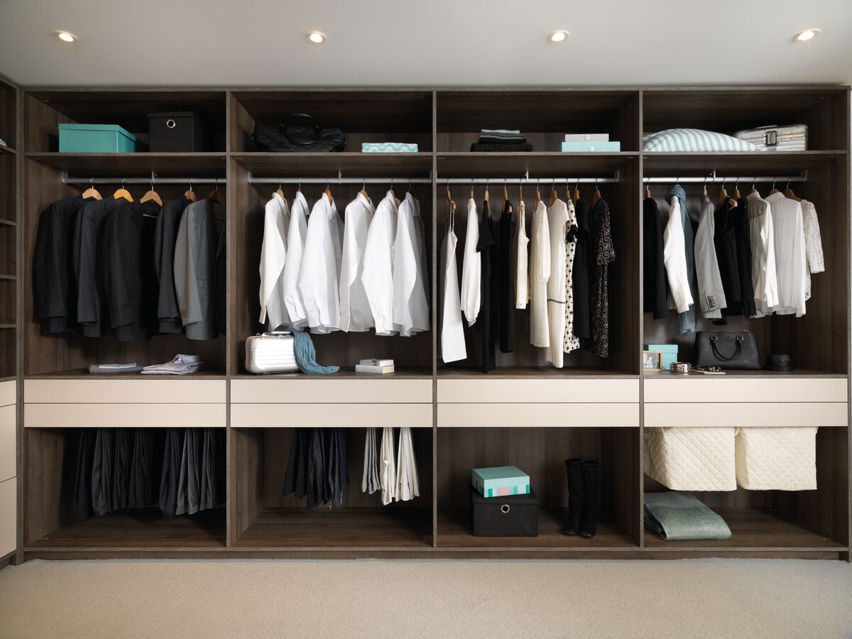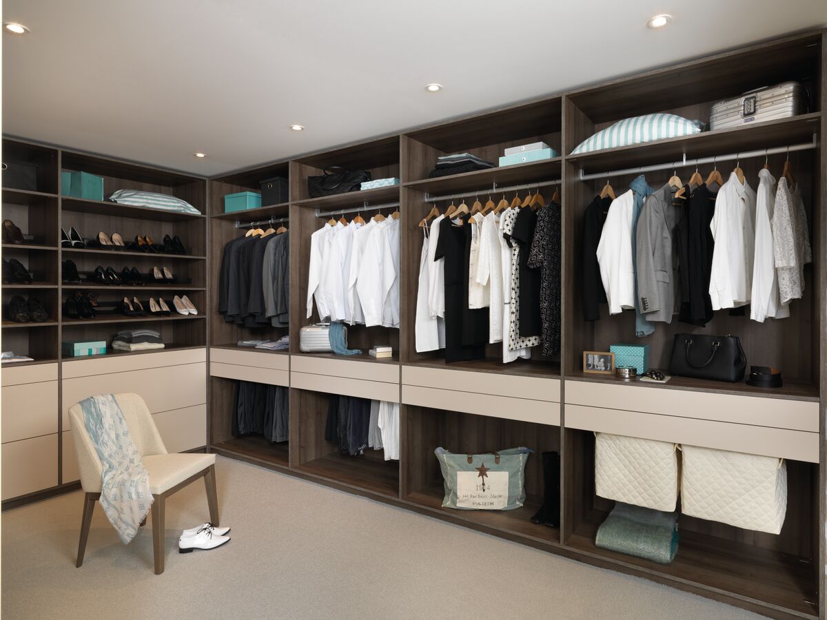 Offene Ankleide in U-Form in den Melamindekoren Vison und Tabacco.
